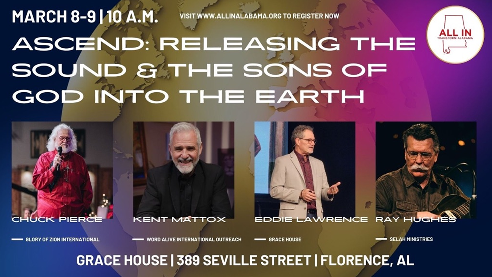 We are excited about Chuck Pierce coming to Florence. On Saturday, March 8th, we are hosting an All in Alabama meeting. If you plan to attend, you will need to register. There is no cost to register but we need to register to be able to facilitate those who attend. Register now and get your free tickets to attend. https://www.allinalabama.org/ascend